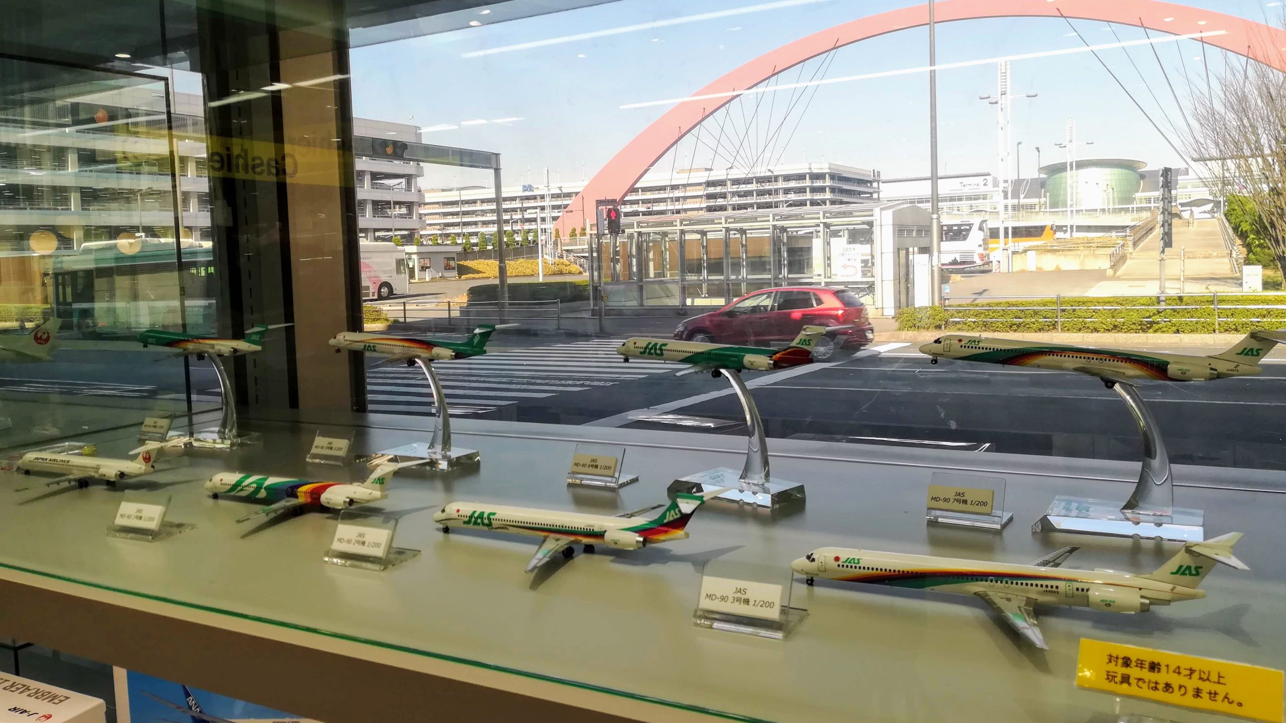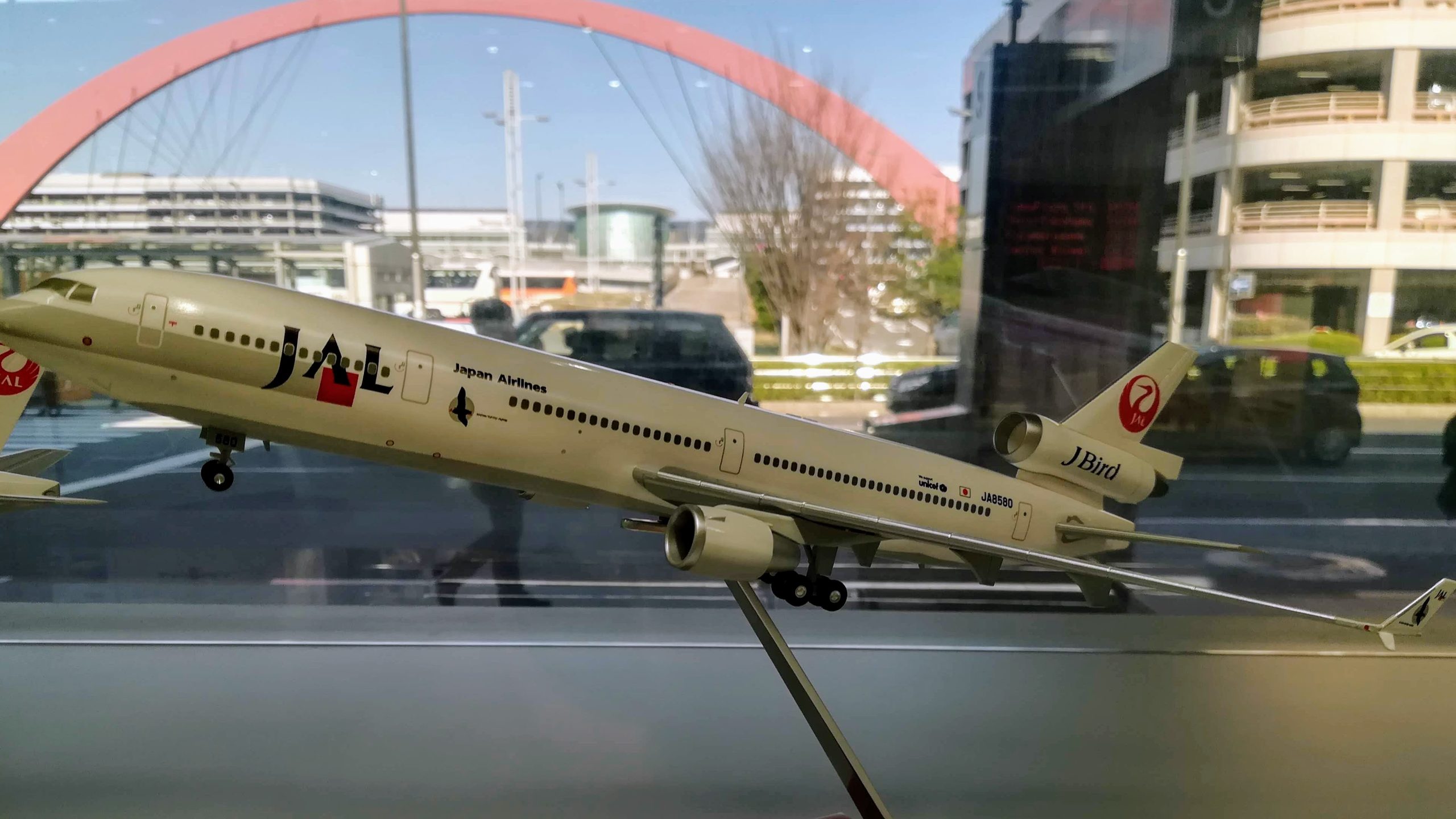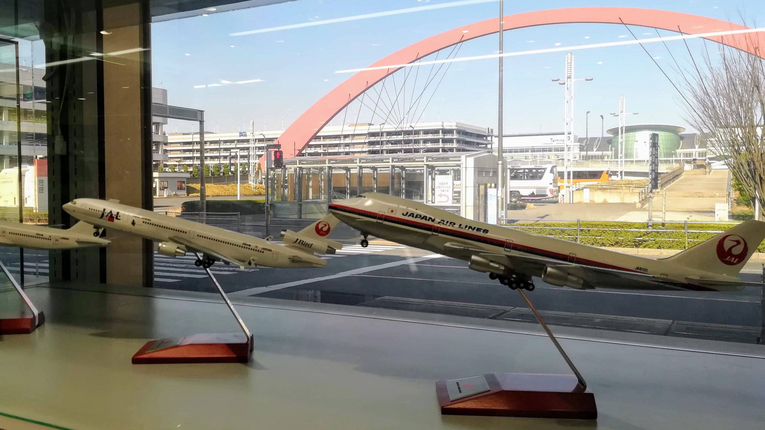 航空機模型の奥に見える青空と羽田スカイアーチの親和性、胸に迫るものがあります…!