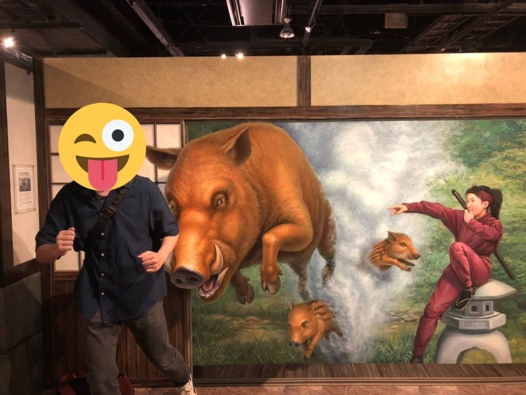 今にも飛び出してきそうな立体的なイラストがあちこちに目白押しで、その中に我々が入り込んでポーズを取ることで唯一無二のアートが完成するのです!