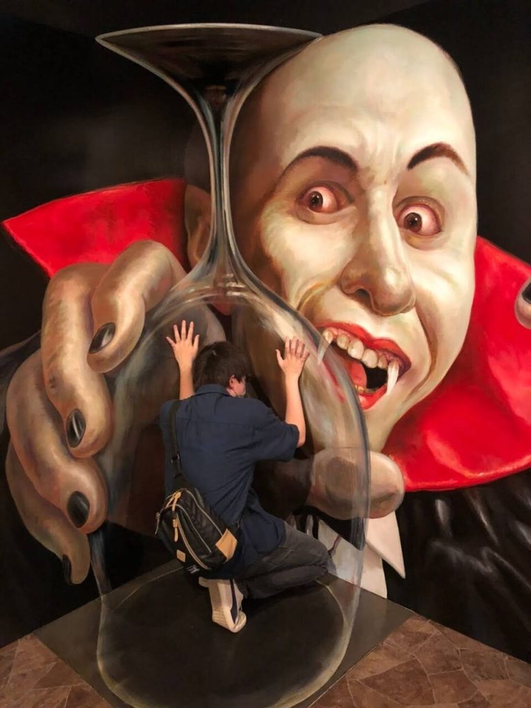 そもそもトリックアートとは何ぞや?というところですが、これは人間の錯覚を利用して絵画が立体的に見えるなど、見える角度によって作品に全く異なる印象を抱かせたり、更にはその中に入って自らもアートの一部になりつつ錯覚を体感できる…というもの。