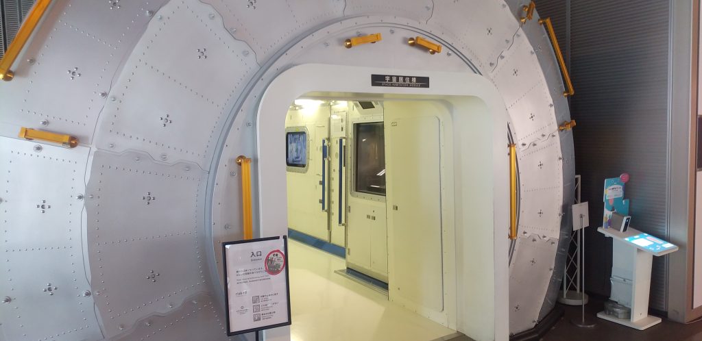 国際宇宙ステーションのコーナーでは、宇宙空間を模した傾斜した空間で寝袋やトイレ、宇宙食の展示を見ることができました。