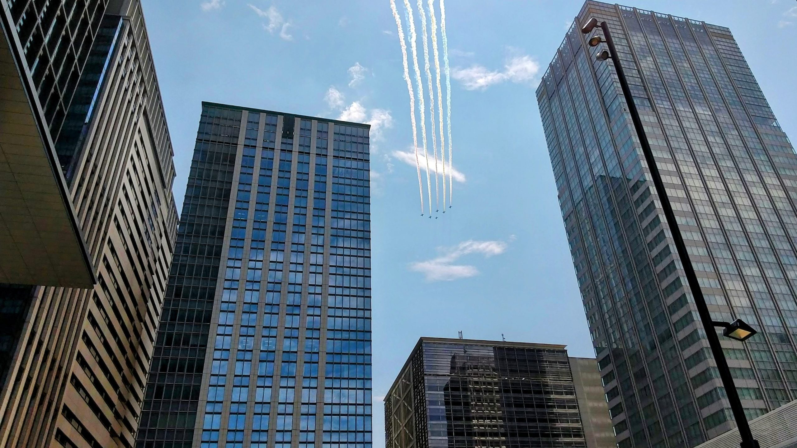 お昼を楽しんだのち、屋外(TOKYO TORCH Park)に出てみると、思いがけずブルーインパルスの五輪飛行に遭遇!!